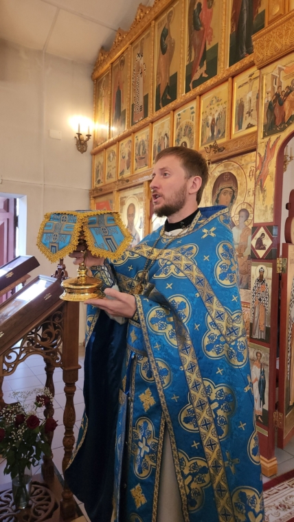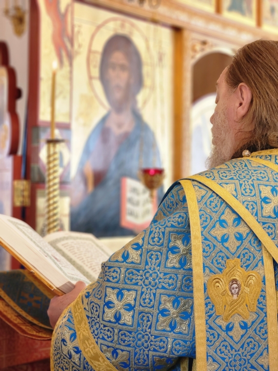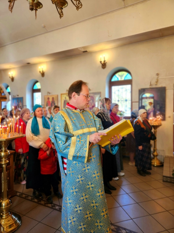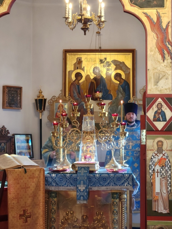 Велича́ем Тя,/ Пресвята́я Де́во,/ и чтим Покро́в Твой святы́й:/ Тя бо ви́де святы́й Андре́й на возду́се,/ за ны Христу́ моля́щуюся.