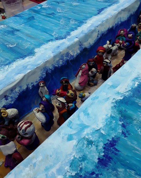 На уроке в кружке рисования дети с помощью преподавателя Любови Кирюшкиной продолжили рассмотрение темы через создание наглядного примера и проиллюстрировали это событие — вылепили фигурки израильтян из пластилина и начали составлять репродукцию событий Ветхого Завета. А ребята старшей группы присоединились к работе и завершили коллективную композицию.