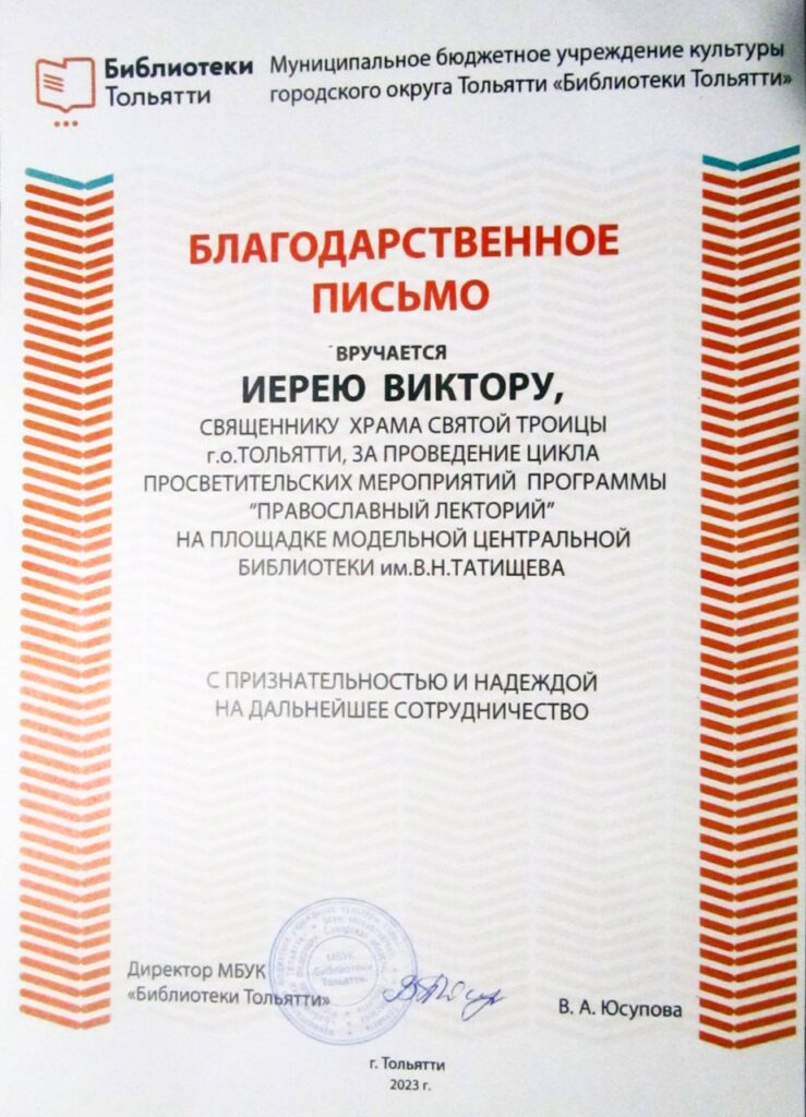 Благодарственное письмо за проведение цикла просветительских мероприятий программы «ПРАВОСЛАВНЫЙ ЛЕКТОРИЙ» в 2023 году на площадке модельной Центральной библиотеки им.В.Н.Татищева было вручено клирику нашего Прихода — иерею Виктору Мишкову директором МБУК «Библиотеки Тольятти» В. А. Юсуповой с признательностью и надеждой на дальнейшее сотрудничество.