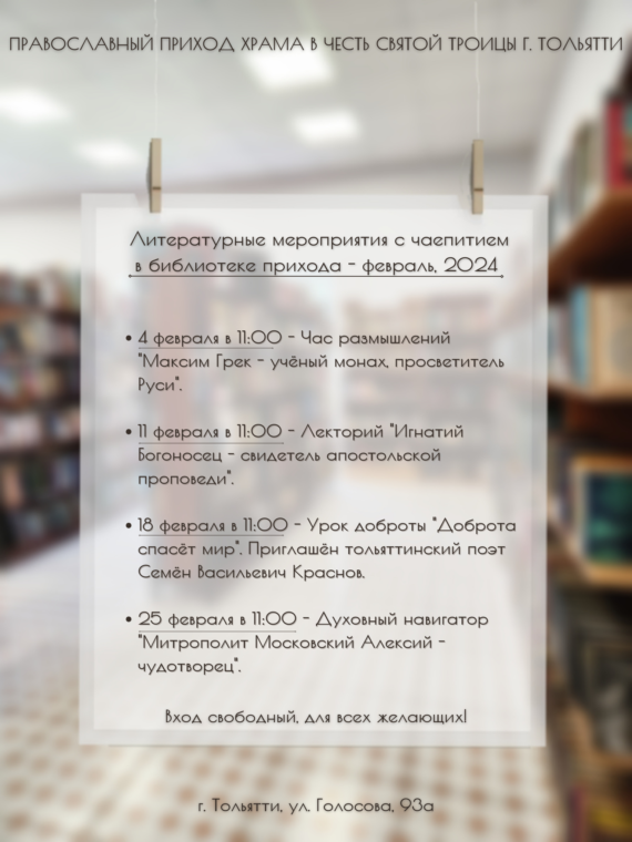 Анонс мероприятий в библиотеке на февраль 2024г. 03.02.2024 03.02.2024 Благодарственное письмо иерею Виктору Мишкову Час размышлений «Максим Грек — учёный монах, просветитель Pycu» Добавить комментарий Отменить ответ Ваш e-mail не будет опубликован. Обязательные поля помечены *КомментарийИмя* Email* Сайт Нажмите галочку (защита от спама) Для того, чтобы иметь возможность комментировать, включите JavaScript в Вашем браузере.