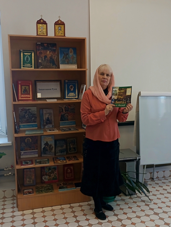 После чаепития библиотекарь Булгакова Лилия познакомила присутствующих с житием святого, его подвигами и вкладом в укрепление Церкви и Российского государства, а также чудесным исцелением от слепоты жены татарского хана Джанибека Тайдулы по молитве святого. Рассказала историю обретения Иверской иконы Божией Матери и представила книжную выставку «Защитники Руси».