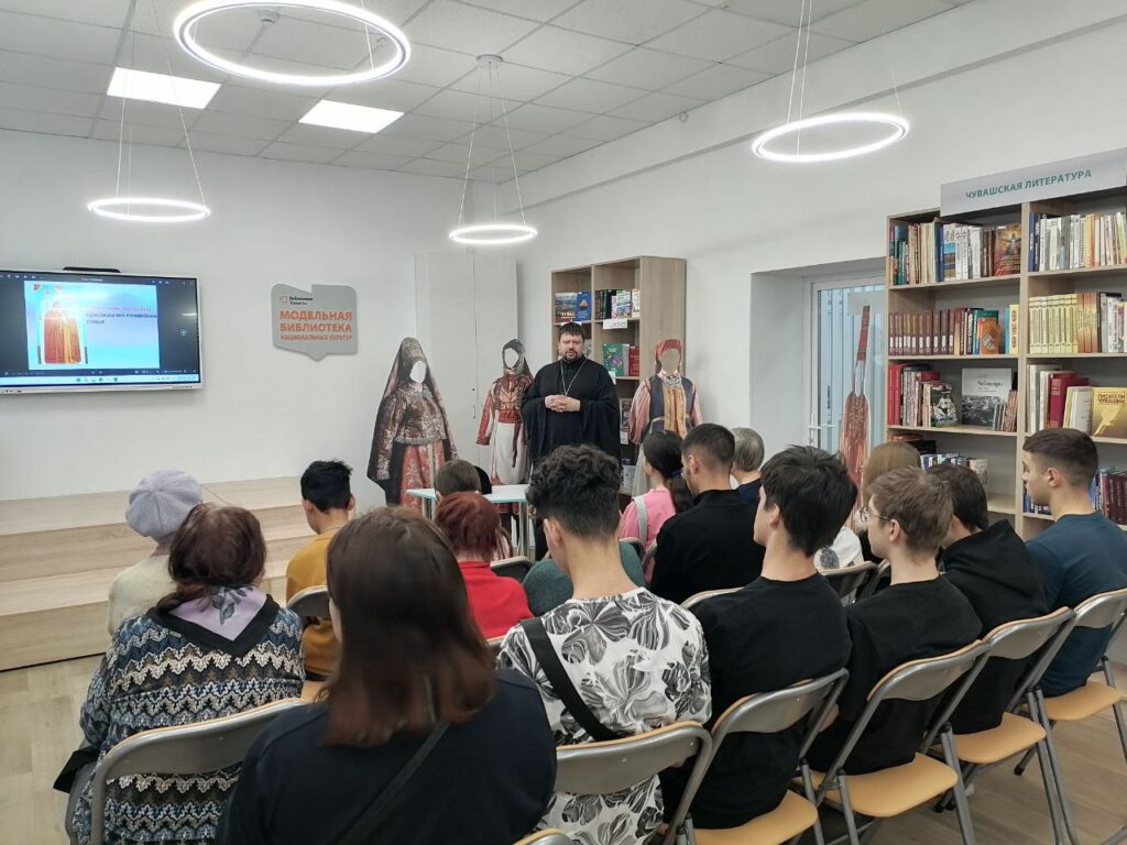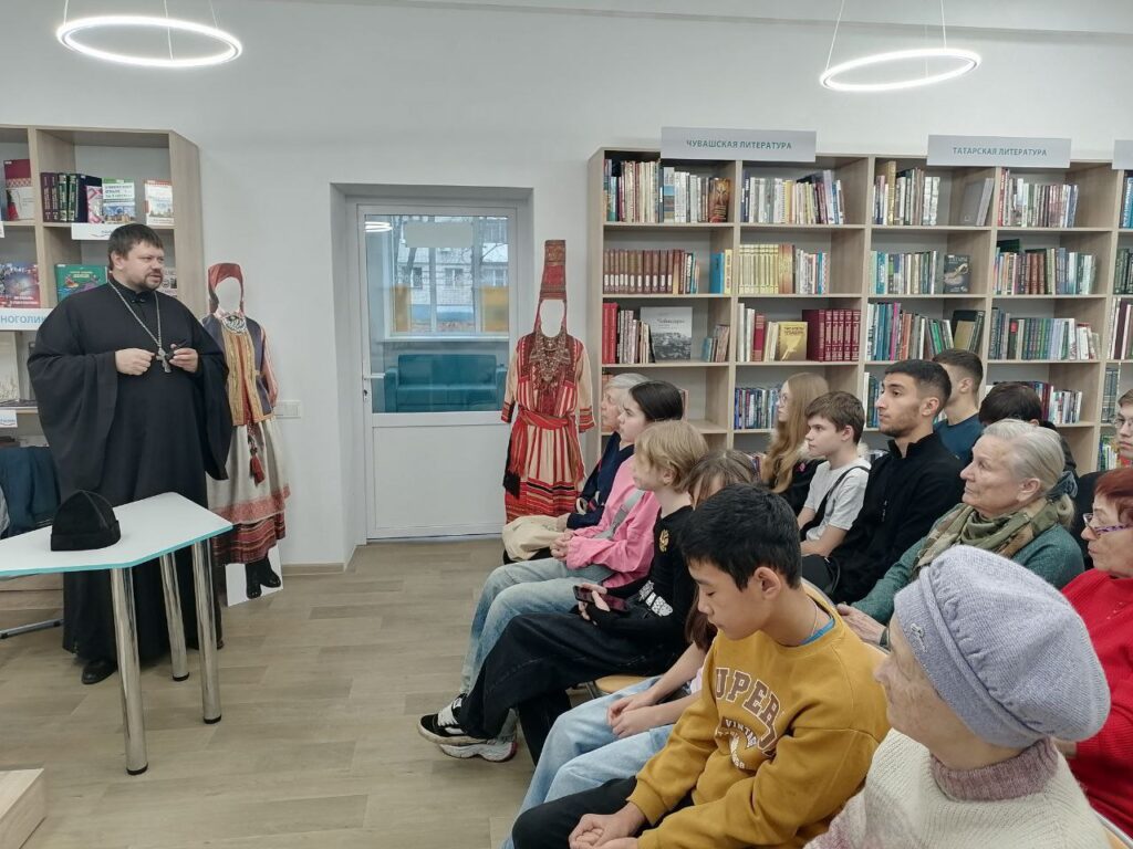 27 октября 2025 года клирик нашего прихода, иерей Виктор Мишков, посетил Модельную библиотеку национальных культур (ул. Горького, 42), где провел просветительскую лекцию для учащихся 7А и 9А классов средней школы № 4. Тема встречи — «Брак – таинство любви: христианское понимание семьи».