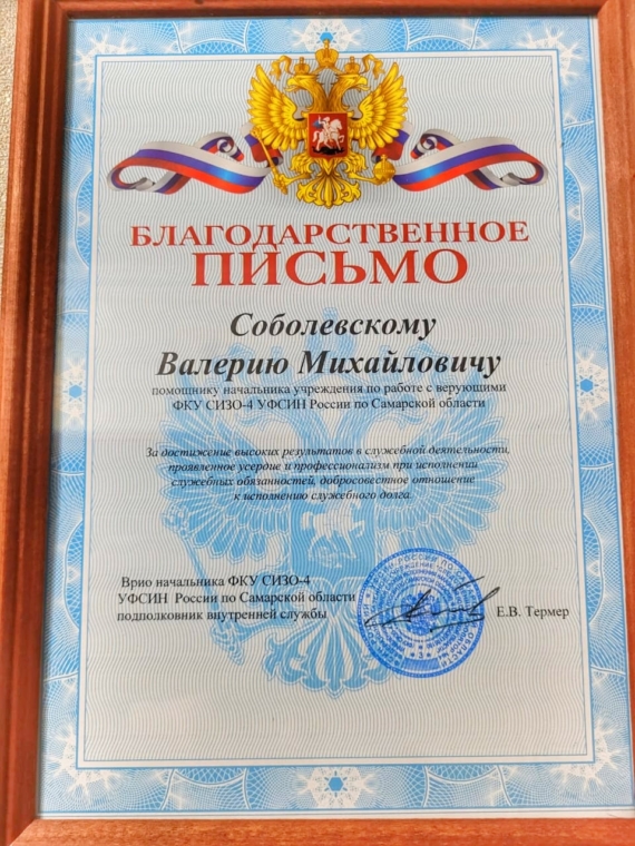 Отец Валерий, являясь помощником начальника учреждения по работе с верующими, получил благодарственное письмо за высокие результаты в служебной деятельности, проявленные усердие и профессионализм.