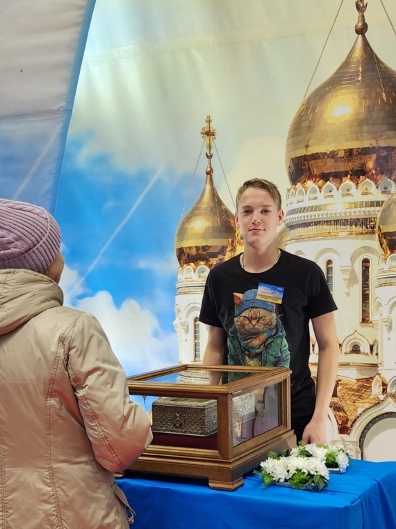 Особую радость нам доставляет то, что у главных святынь выставки волонтёром работает наш добрый выпускник кружка «Рукодельница» Максим, всегда готовый помочь и ответить на вопросы.