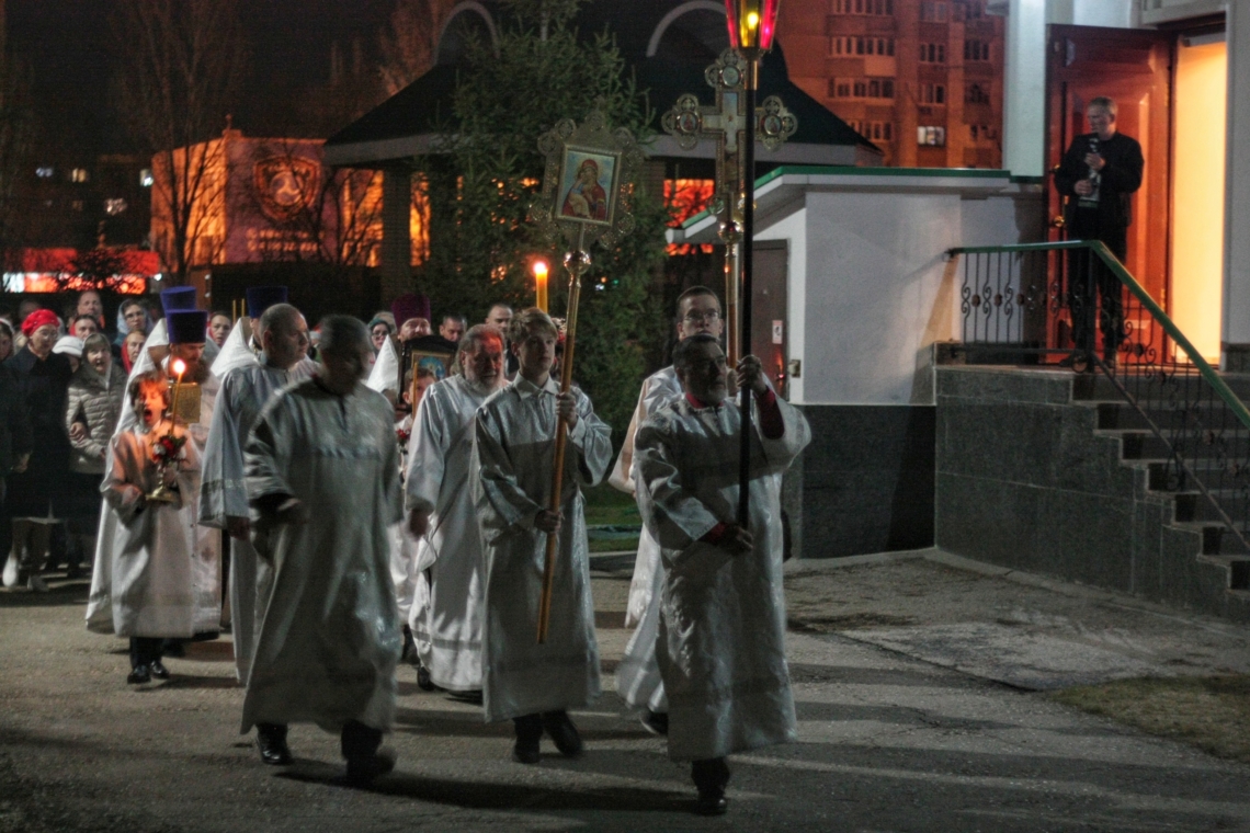 Богослужение началось с пасхальной полунощницы, после которой состоялся Крестный ход — торжественное шествие вокруг храма. И когда процессия остановилась у закрытых дверей, впервые в этом году прозвучал радостный возглас: