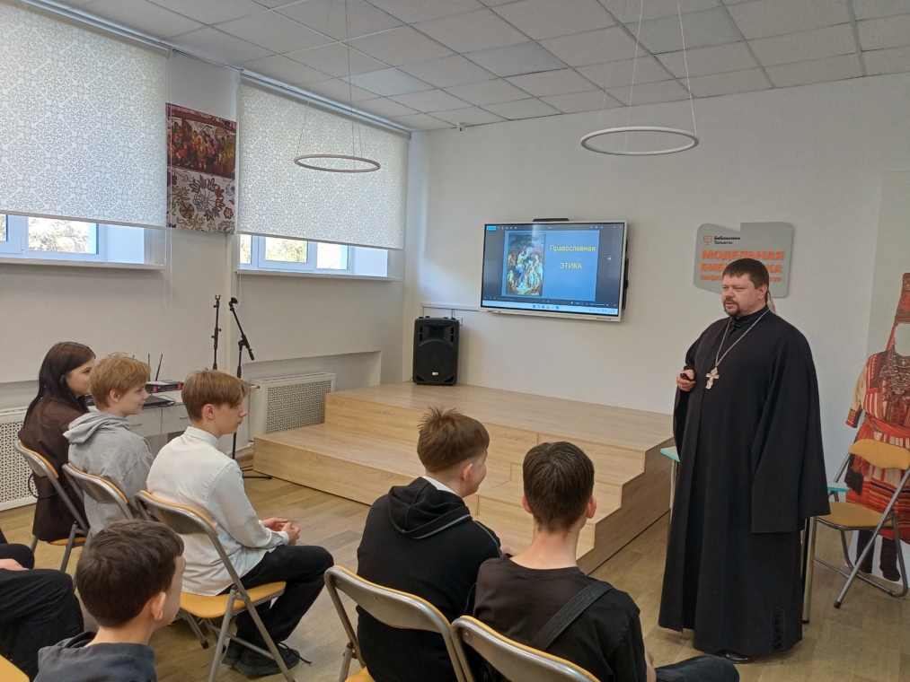 23 апреля клирик нашего прихода, иерей Виктор Мишков, посетил Модельную библиотеку национальных культур (ул. Горького, 42), где в рамках православного лектория провёл встречу с учениками 8-х классов средней школы №4.